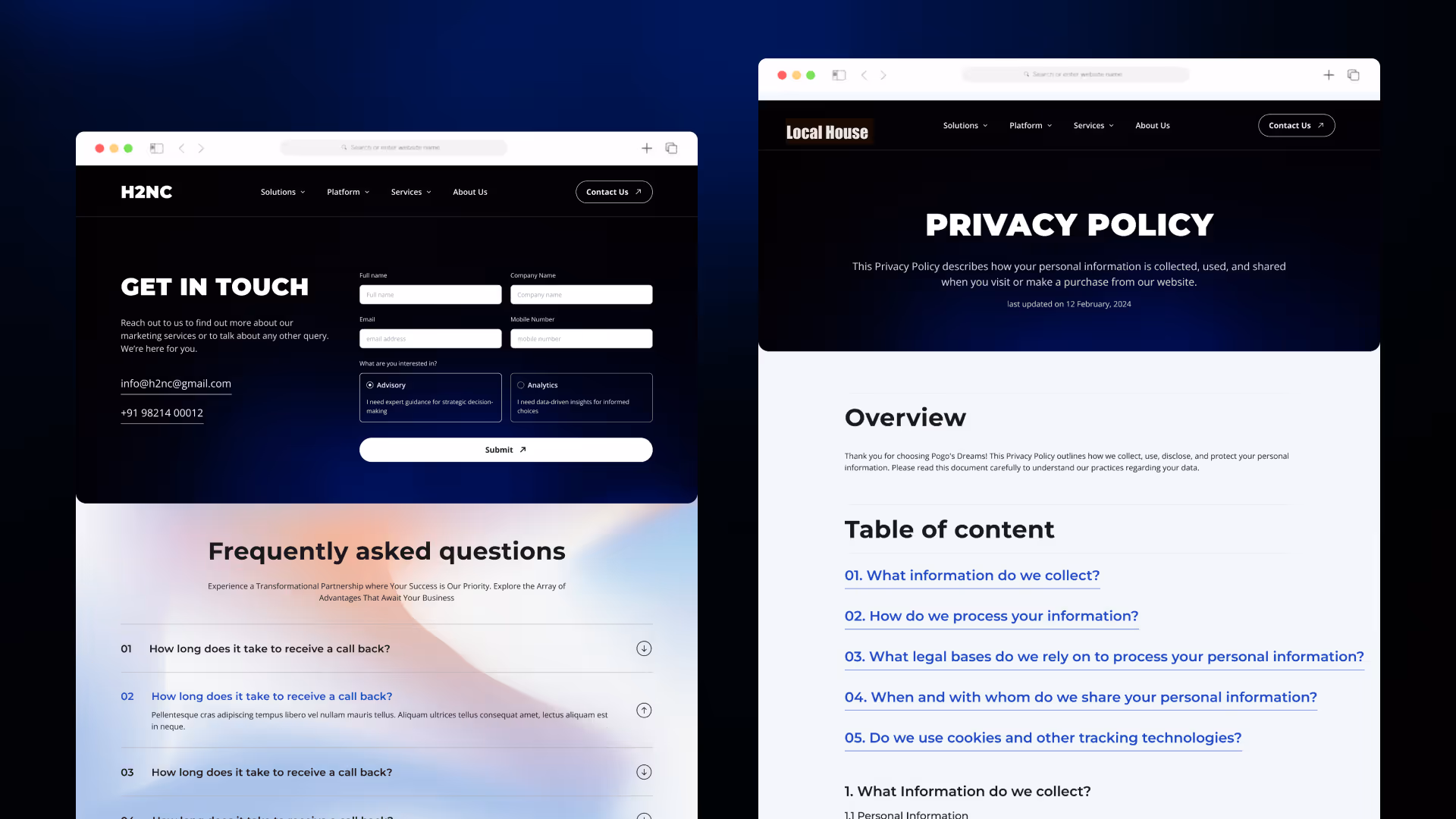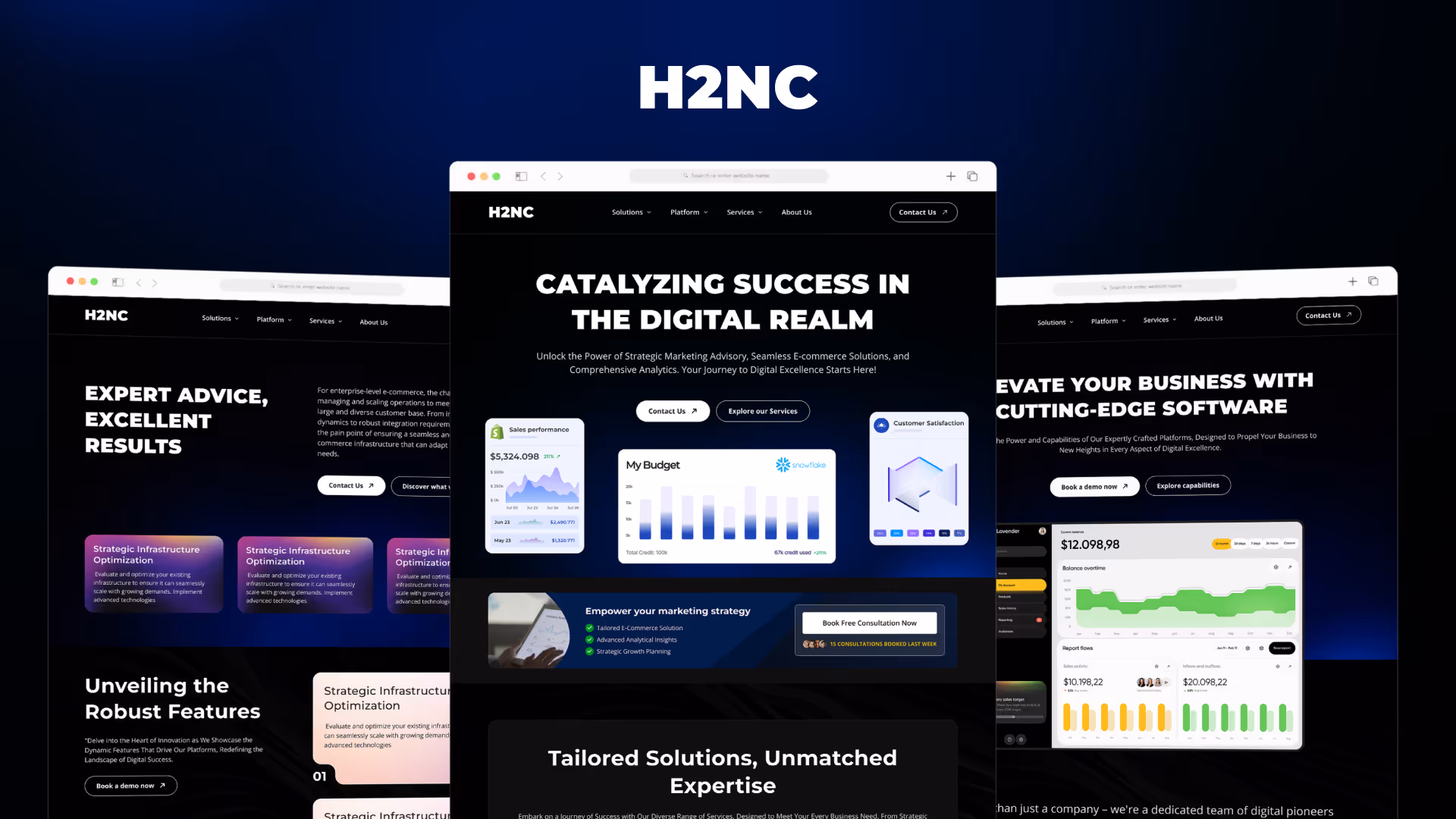 - Website Development: The website was designed and developed to serve as a digital hub for "H2NC's" services and expertise. Utilizing modern design principles and user-centric approach, we created an intuitive and engaging platform that highlights the company's core offerings and encourages visitor engagement.