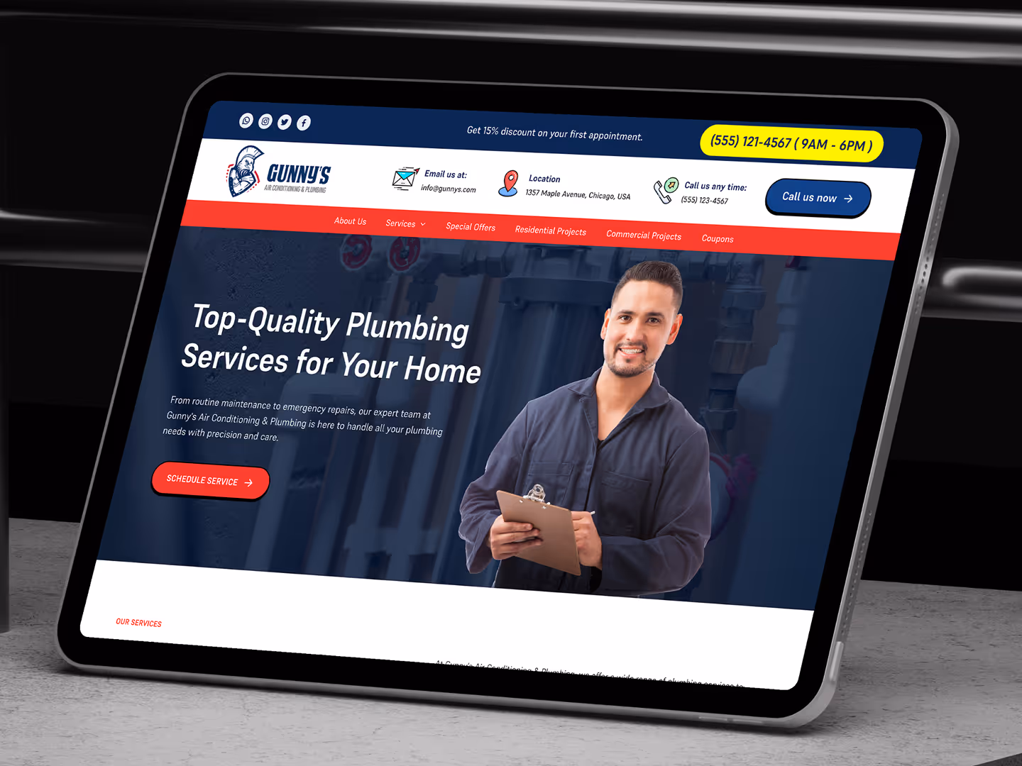 The client approached the project with a clear intention: to design a highly functional website that feels local, trustworthy, and distinctly American. There was a strong emphasis on usability, especially for older audiences, and on visually reinforcing Gunny’s values—service, integrity, and community. The website needed to showcase a broad range of HVAC and plumbing services, highlight exclusive veteran discounts, and make it incredibly easy for users to reach out.